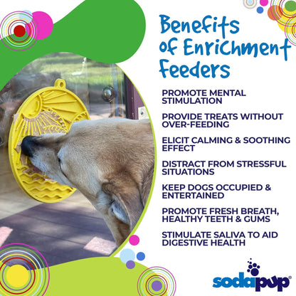 ¡Escapa de la tristeza del invierno con nuestra alfombrilla para lamer enriquecida de Sun n' Sea! Inspirado en las islas tropicales, es perfecto para untar los alimentos blandos favoritos de tu cachorro y darle unas vacaciones lejos del aburrimiento. Di aloha a un perro feliz y entretenido con la ayuda de nuestra alfombrilla para lamer con ventosa. Enriquecimiento: lamer alivia y calma a tu perro. Extienda la golosina blanda favorita de su mascota sobre la superficie de la alfombrilla, asegurándose de que la golosina quede empujada hacia abajo contra la superficie de la alfombrilla. Este eMat es la herramienta de enriquecimiento perfecta para tu perro. GRADO DE DIFICULTAD: Fácil BENEFICIOS Calma a tu perro lamiéndolo. Entretenga a su mascota. Evite la sobrealimentación. Promueve un aliento fresco y dientes y encías sanos.